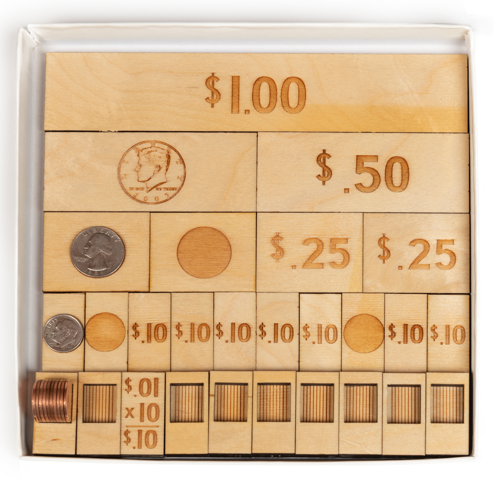 Wooden pieces carefully crafted to hold 4 quarters, 10 dimes, 20 nickels, and 100 pennies. Used to teach the value of different coins in relationship to each other and to a dollar.