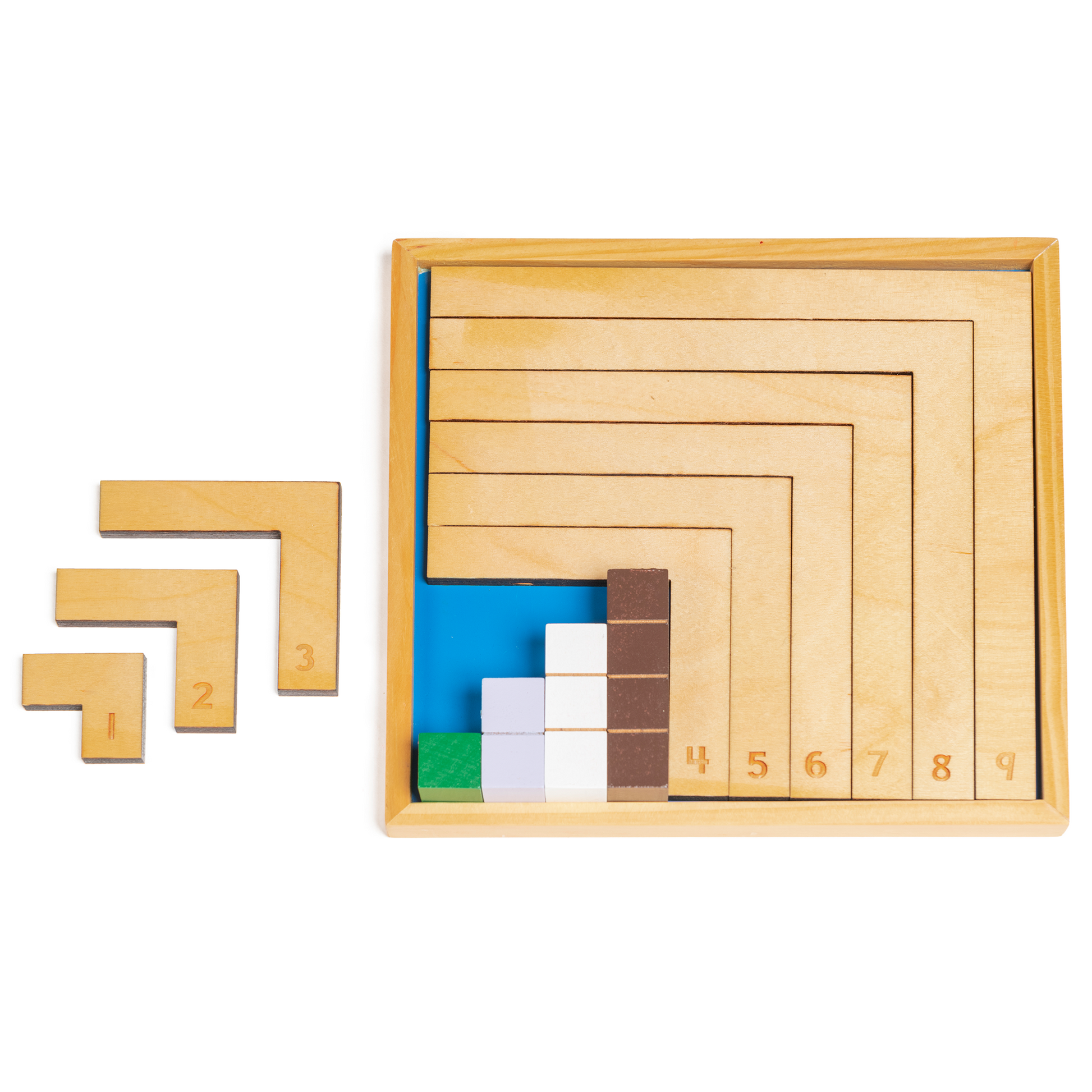 Wooden "L" frames for numbers 1-9 that fit inside a 10-box. Used to teach fact families for each number.